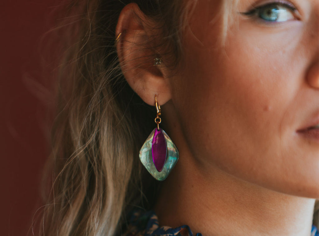 La nacre colorée, notre signature Au cœur de nos bijoux, la nacre révèle des reflets chatoyants qui rendent chaque création véritablement unique. Cette matière naturelle d'exception sublime nos boucles d'oreilles, colliers, bracelets et bagues.