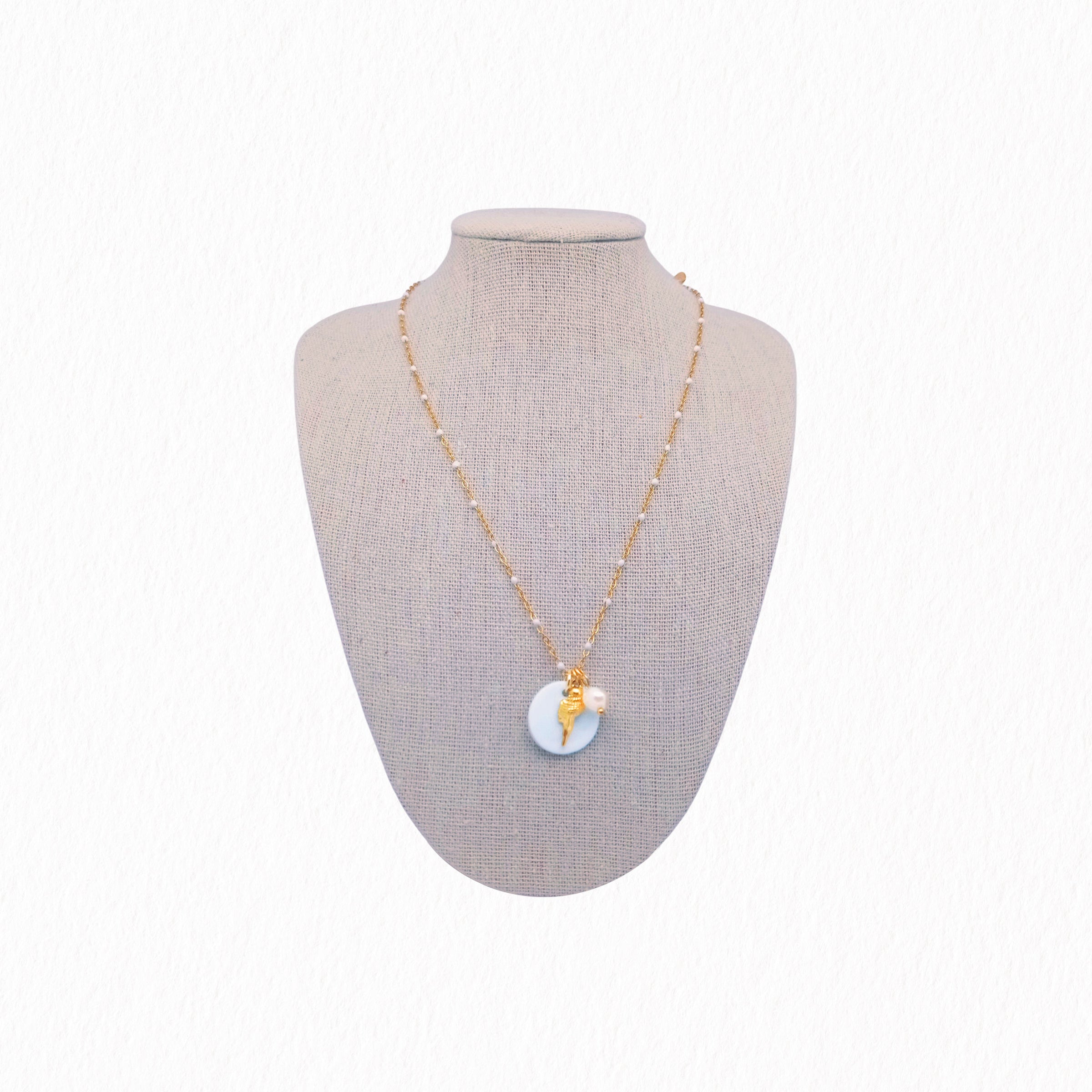 Joli collier avec une fine chaine perlées et une nacre blanche.